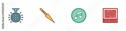 Set Disco ball, Audio jack, Music note, tone and Oscilloscope icon. Vector
