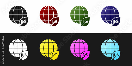 Set Earth globe and leaf icon isolated on black and white background. World or Earth sign. Geometric shapes. Environmental concept. Vector