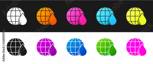 Set Earth planet in water drop icon isolated on black and white background. World globe. Saving water and world environmental protection. Vector Illustration.