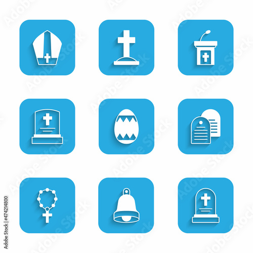 Set Easter egg, Church bell, Grave with tombstone, Holy bible book, Rosary beads religion, sermon tribune and Pope hat icon. Vector