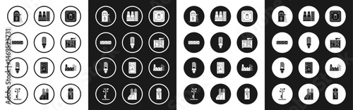 Set Electric light switch, LED bulb, extension cord, car charging station, Diesel power generator, Power plant and factory, and icon. Vector
