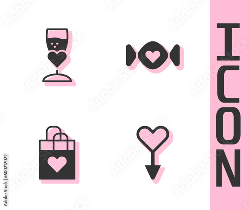 Set Female gender symbol, Glass of champagne, Shopping bag with heart and Candy icon. Vector