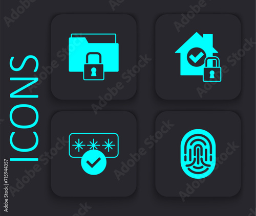 Set Fingerprint, Folder and lock, House under protection and Password icon. Black square button. Vector