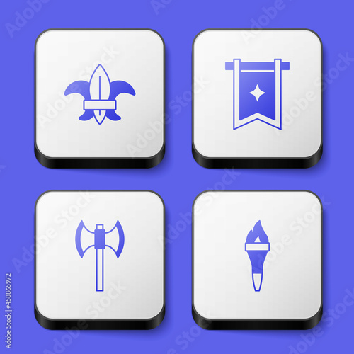 Set Fleur de lys or lily flower, Medieval flag, poleaxe and Torch flame icon. White square button. Vector