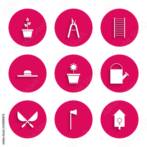 Set Flower in pot, Wooden axe, Retro wall watch, Watering can, Gardening handmade scissors, Worker hat, staircase and Plant icon. Vector