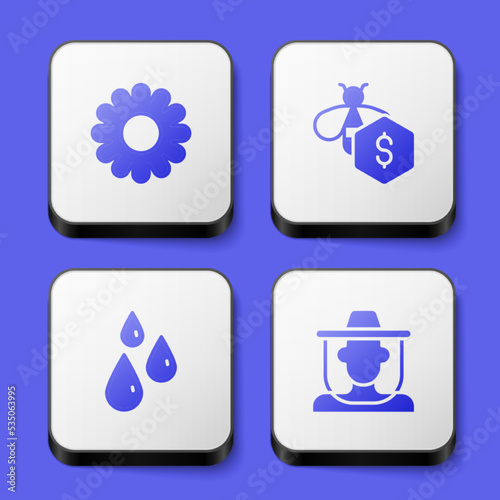 Set Flower, Sale of bees, Drops honey and Beekeeper with protect hat icon. White square button. Vector