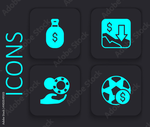 Set Football betting money, Money bag, Financial growth decrease and Hand holding casino chips icon. Black square button. Vector