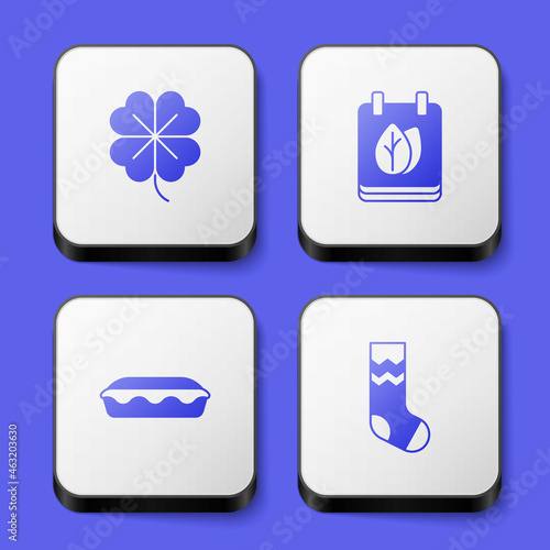 Set Four leaf clover, Calendar with autumn leaves, Homemade pie and Socks icon. White square button. Vector