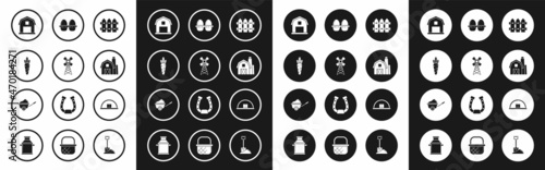 Set Garden fence wooden, Windmill, Carrot, Farm House concept, Chicken egg box, Hangar and Wheelbarrow with dirt icon. Vector