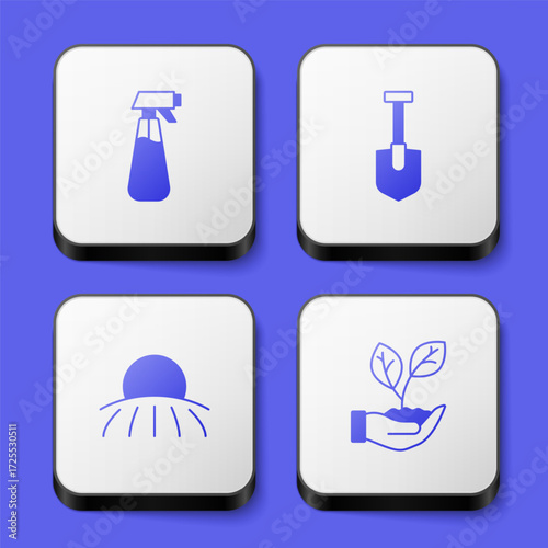 Set Garden sprayer for water, Shovel, Sunrise and Leaf in hand icon. White square button. Vector