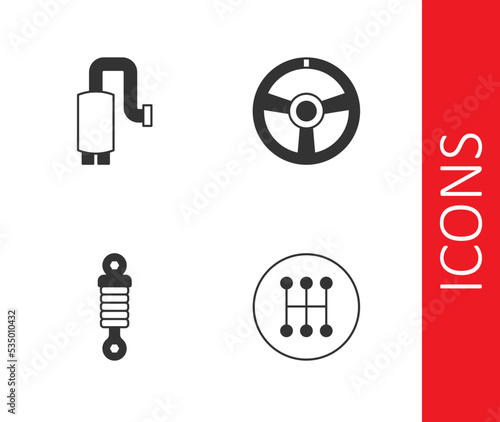 Set Gear shifter, Car muffler, Shock absorber and Racing steering wheel icon. Vector