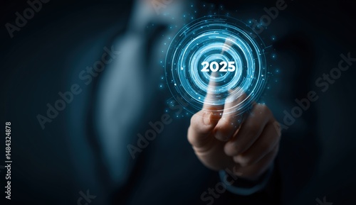 Set goals and strategy for 2025,Businessman holding icon of year 2025 with target arrow on virtual screen,Planning for future growth and success,Development to achieve goals and success,Investment