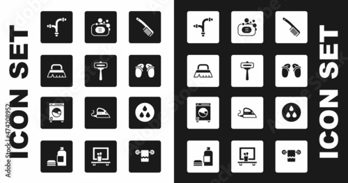 Set Hairbrush, Shaving razor, Brush for cleaning, Industry metallic pipe, Flip flops, Bar of soap, Water drop and Washer icon. Vector