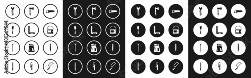 Set Hand saw, Corner ruler, Putty knife, Metallic screw, Paint bucket, Wooden axe, Pencil with eraser and nail icon. Vector