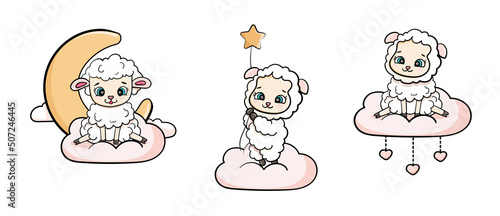 set happy cartoon cute baby sheep sitting on a cloud under moon and stars vector sticker illustration isolated card.