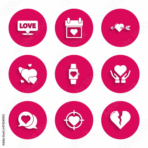 Set Heart in the center wrist watch, of darts target aim, Broken heart or divorce, on hand, speech bubble, Amour with arrow and Speech text love icon. Vector