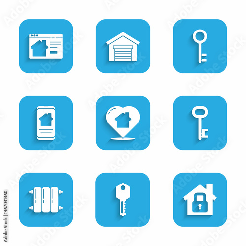 Set House with heart shape, key, under protection, Heating radiator, Online real estate house, and icon. Vector