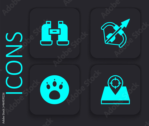 Set Hunt place, Binoculars, Medieval bow and arrow and Paw search icon. Black square button. Vector