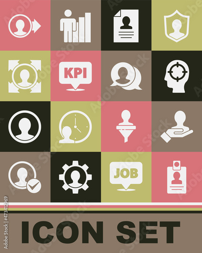 Set Identification badge, Hand for search people, Head hunting, Resume, Key performance indicator, Create account screen and Speech bubble chat icon. Vector