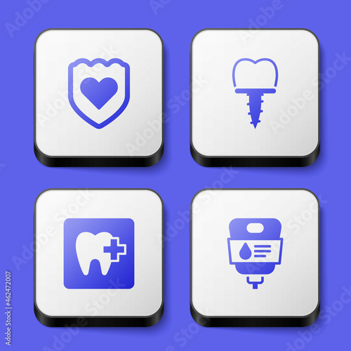 Set Immune system, Dental implant, clinic location and IV bag icon. White square button. Vector