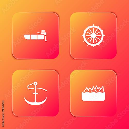 Set Inflatable boat with motor, Ship steering wheel, Anchor and Sharp stone reefs icon. Vector