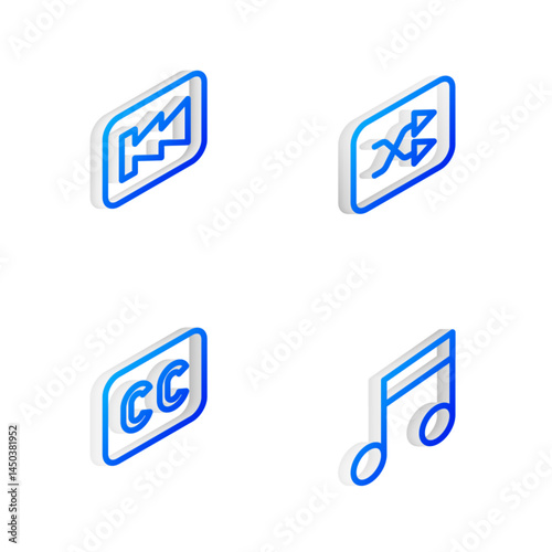 Set Isometric line Arrow shuffle, Rewind button, Subtitles and Music note, tone icon. Vector