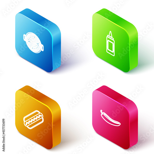 Set Isometric line Barbecue grill with sausage, Mustard bottle, Hotdog sandwich and chili pepper pod icon. Vector
