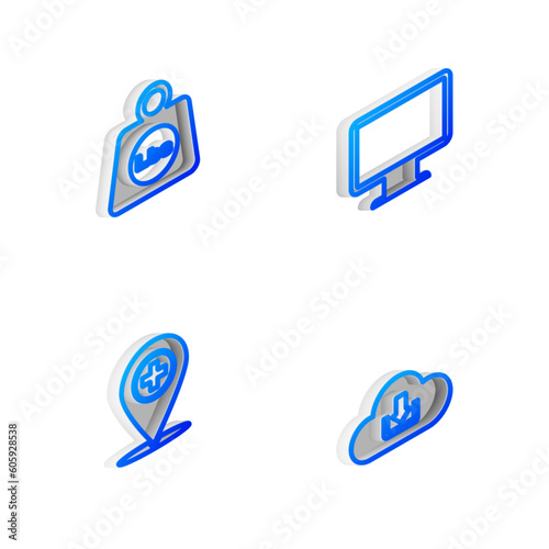 Set Isometric line Computer monitor screen, Weight pounds, Medical location with cross and Cloud download icon. Vector