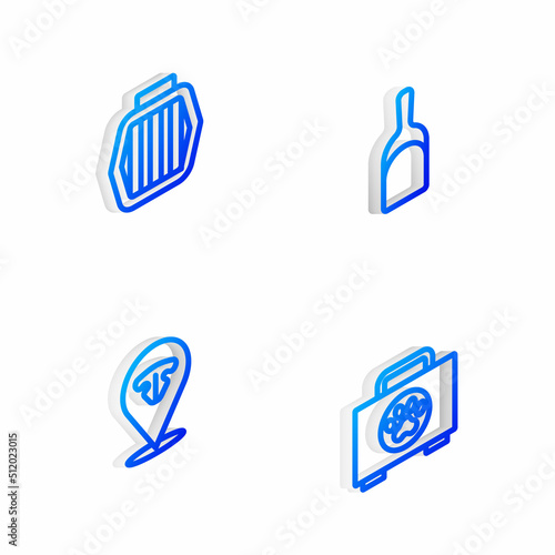 Set Isometric line Dustpan, Pet carry case, Cat nose and first aid kit icon. Vector
