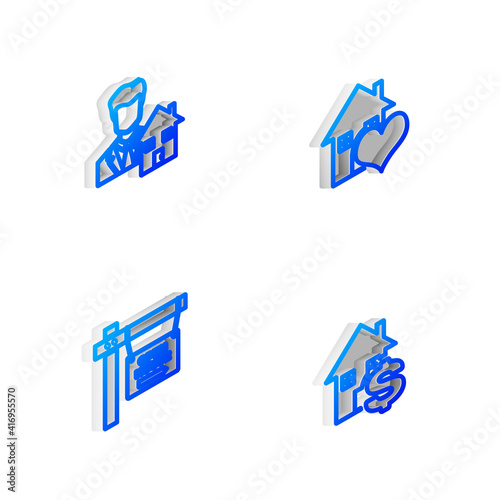 Set Isometric line House with heart shape, Realtor, Hanging sign Open house and dollar icon. Vector.