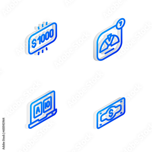 Set Isometric line Lucky wheel, Money prize in casino, Online poker table game and Stacks paper money cash icon. Vector