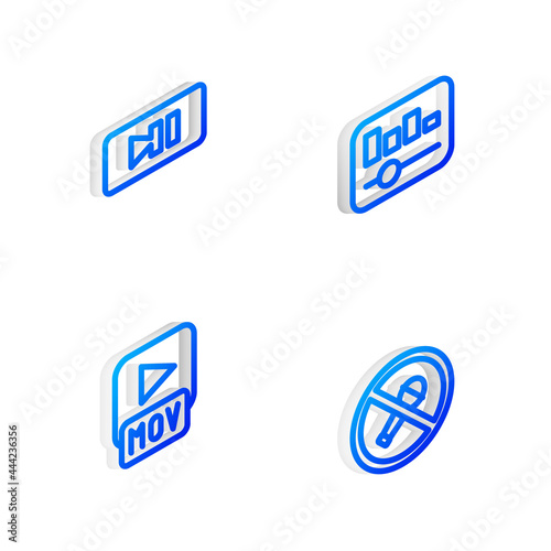 Set Isometric line Music equalizer, Pause button, MOV file and Mute microphone icon. Vector