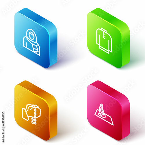 Set Isometric line Muslim woman in hijab, Shirt kurta, Hands praying position and prays icon. Vector