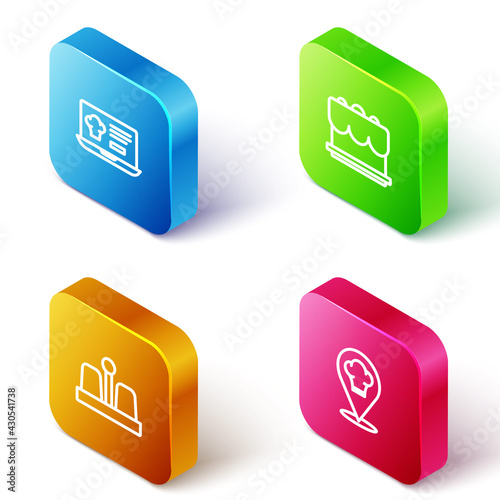 Set Isometric line Online ordering and delivery, Cake, Salt pepper and Chef hat with location icon. Vector