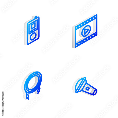Set Isometric line Online play video, Music player, Audio jack and Microphone icon. Vector.