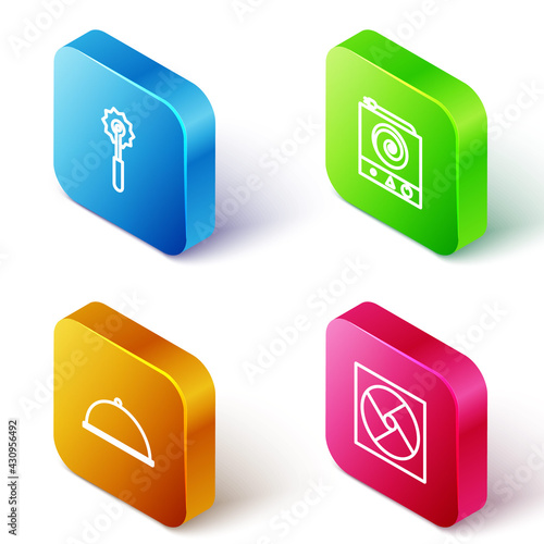 Set Isometric line Pizza knife, Electric stove, Covered with tray and Ventilation icon. Vector