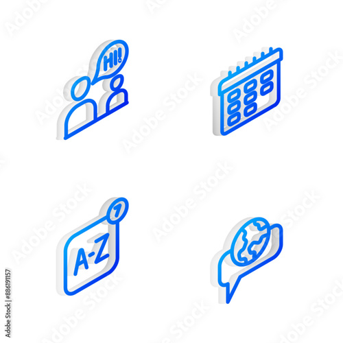 Set Isometric line School timetable, Two sitting men talking, Online translator and Learning foreign languages icon. Vector