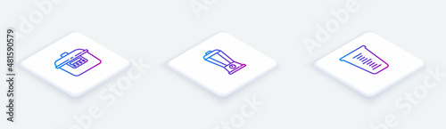 Set Isometric line Slow cooker, Blender and Measuring cup. White square button. Vector