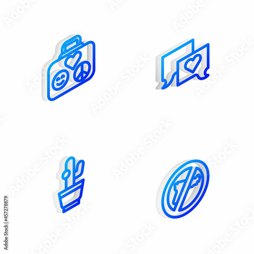 Set Isometric line Speech bubble chat, Suitcase for travel, Cactus and No war icon. Vector