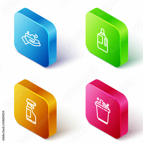 Set Isometric line Washing hands with soap, Fabric softener, Spray bottle detergent liquid and Bucket suds icon. Vector