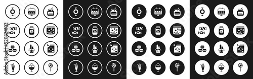 Set Jar of honey, Cherry jam jar, Candy, packaging for sweets, Cake plate, and Macaron cookie icon. Vector