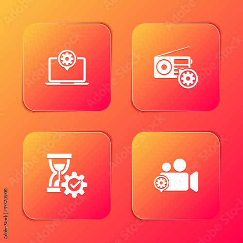 Set Laptop setting, Radio, Hourglass and Video camera icon. Vector
