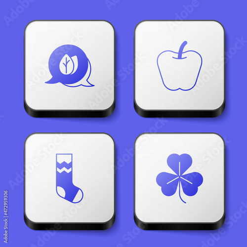 Set Leaf, Apple, Socks and Clover icon. White square button. Vector