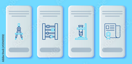 Set line Abacus, Glass test tube flask on fire, Drawing compass and Certificate template icon. Vector