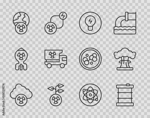 Set line Acid rain and radioactive cloud, Radioactive waste barrel, Light bulb with concept of idea, Planet earth radiation, Truck materials, Atom and Nuclear explosion icon. Vector