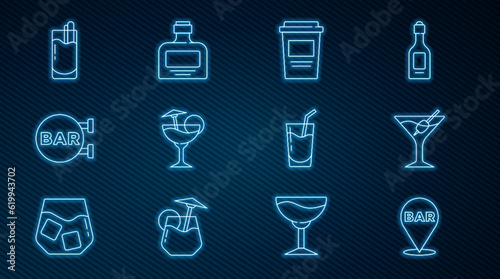 Set line Alcohol bar location, Martini glass, Coffee cup to go, Cocktail, Street signboard with Bar, Bloody Mary, and Whiskey bottle icon. Vector