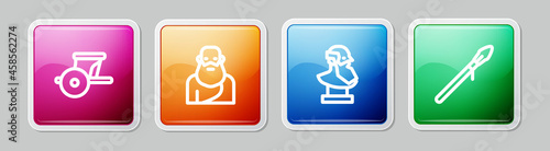 Set line Ancient chariot, Socrates, bust sculpture and Medieval spear. Colorful square button. Vector