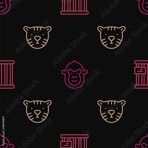 Set line Animal cage, Tiger head and Monkey on seamless pattern. Vector