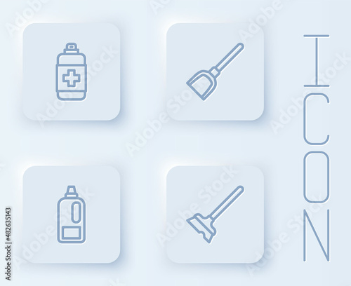 Set line Antibacterial soap, Dustpan, Bottle for detergent and Mop. White square button. Vector