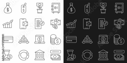 Set line ATM and money, Coin with dollar, Stacks paper cash, Money plant the pot, Mobile banking, Financial growth increase, bag and Inserting coin icon. Vector